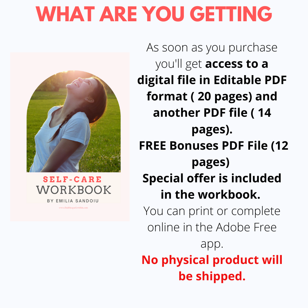 - Self-Care Workbook: A 20-page PDF masterpiece, editable on Adobe or printable, where you’ll master daily self-care practices, boost confidence, and find your inner balance.